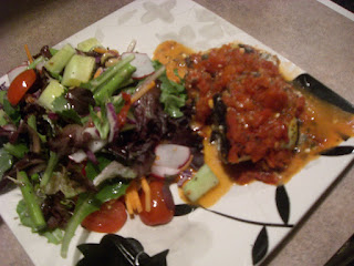 For the sauce, I sautted some onion with the roasted red peppers and diced tomatoes. I then pureed the mix in the blender and topped the eggplant with the sauce. Baked this all in the oven for about 20 min. Egg-celent!