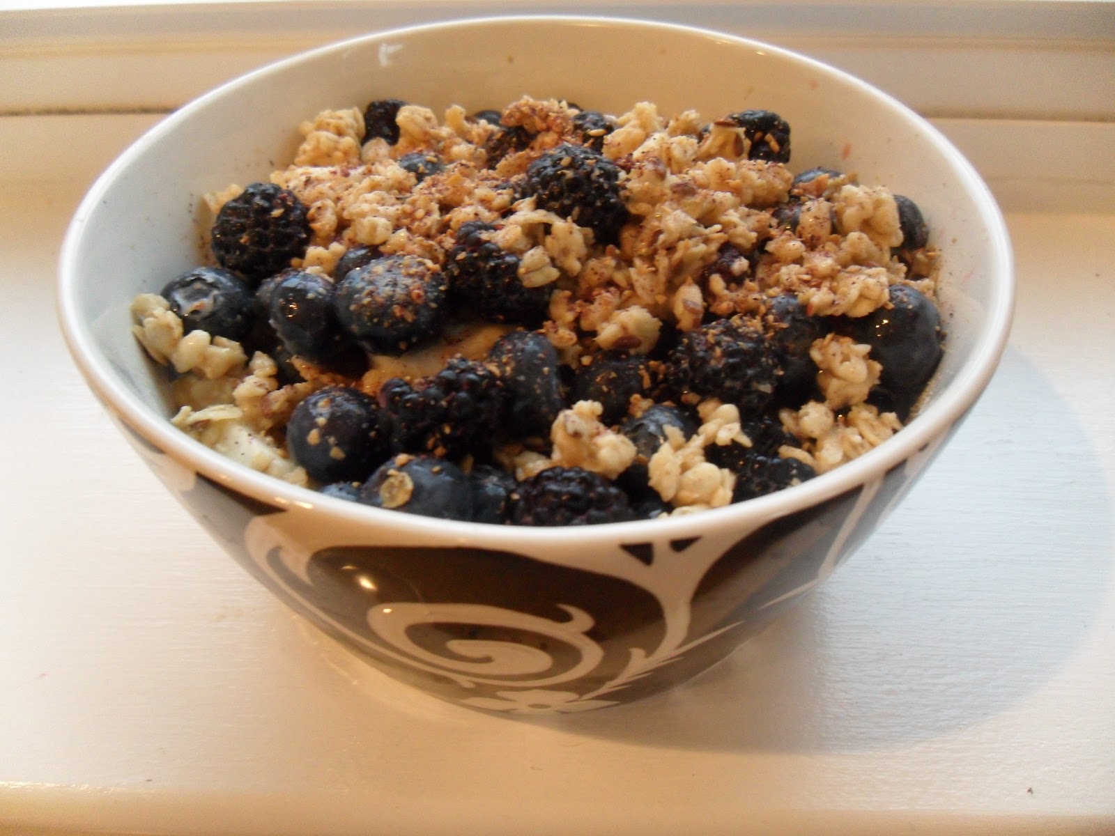 1/4 C Yogi Goji Berry Flax Cereal, 1/4 C Natures Path Flakes, Handful Kashi Honey Sunrise, Raspberries, Blueberries, Natures Path Granola, 1 T Vanilla Sun warrior, Almond Milk